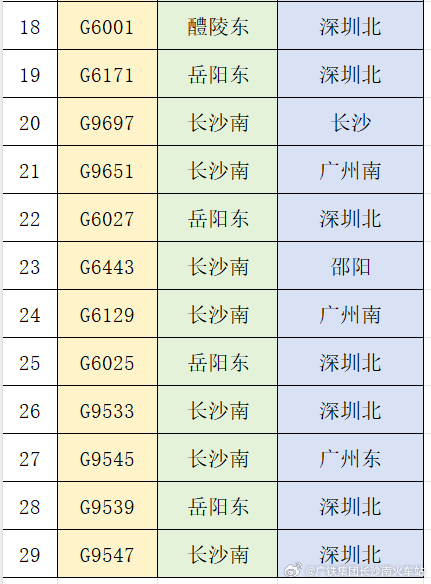 截至7月28日11时,长沙南站管内29列列车停运,具体停运车次如图。