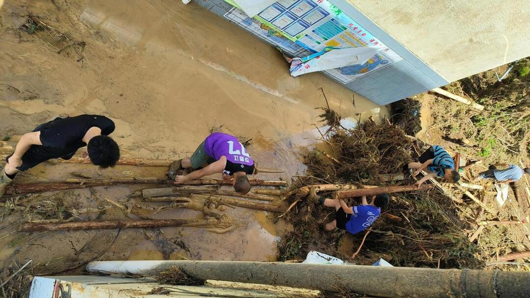 ▲搬离被洪水冲进校园的树干等障碍物,疏通校园道路