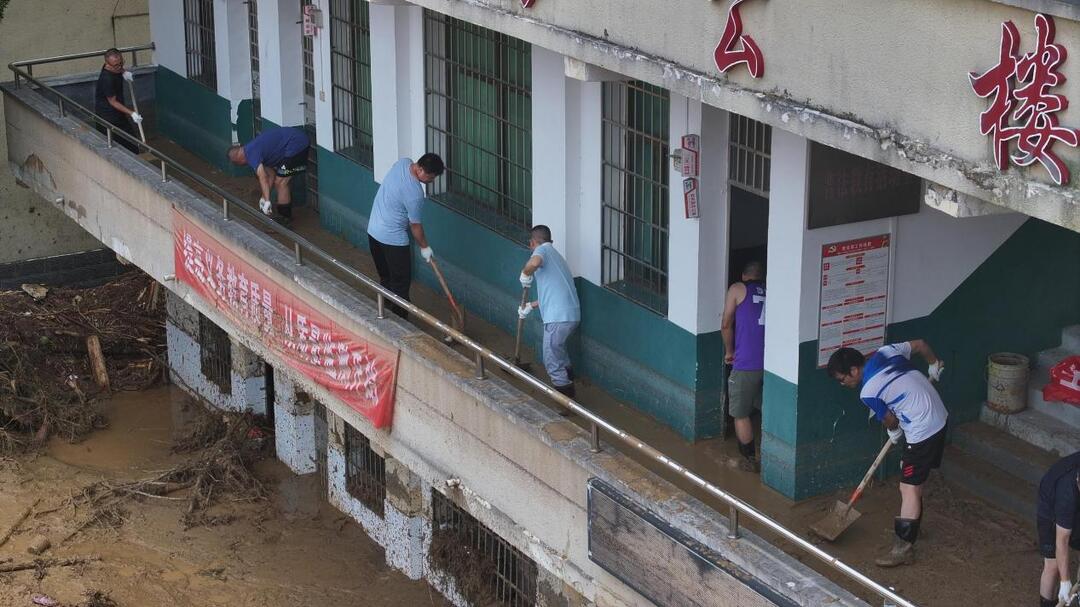 ▲对州门司镇中学教室二楼堆积的淤泥进行清除