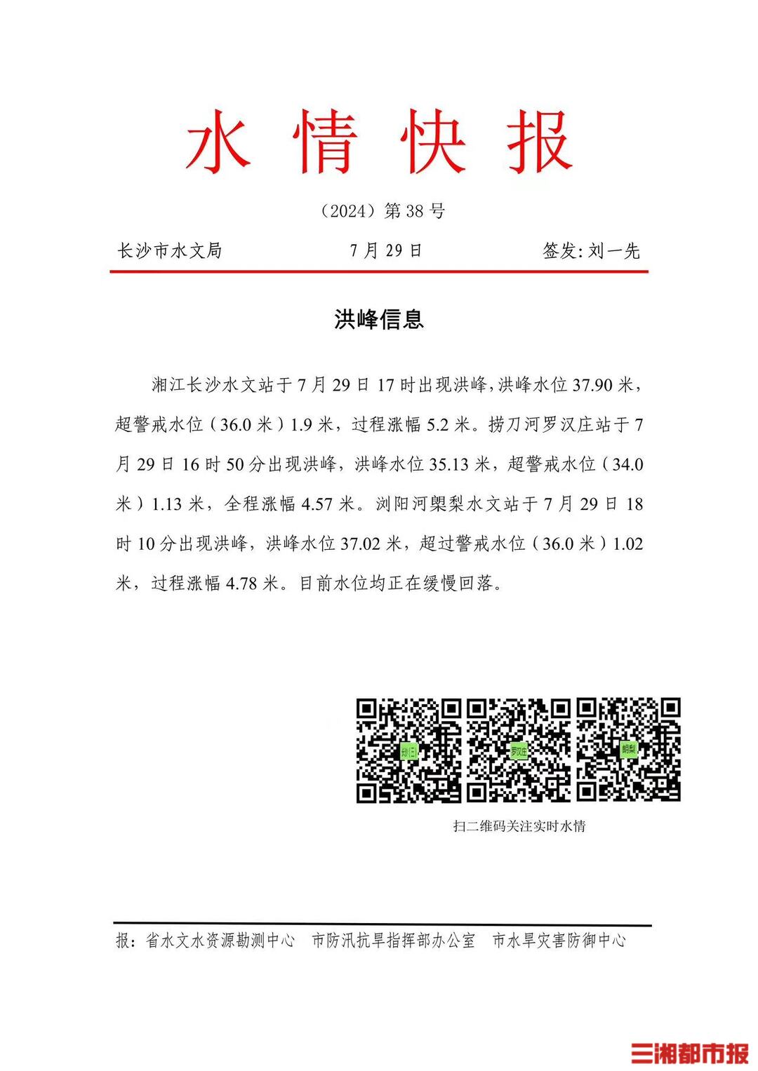 三湘都市报·新湖南客户端7月29日讯(全媒体记者 李致远 通讯员 李海燕)7月29日,记者从长沙市水文局获悉,湘江长沙水文站于7月29日17时出现洪峰,洪峰水位37.90米,超警戒水位(36.0米)1.9米,过程涨幅5.2米。捞刀河罗汉庄站于7月29日16时50分出现洪峰,洪峰水位35.13米,超警戒水位(34.0米)1.13米,全程涨幅4.57米。浏阳河㮾梨水文站于7月29日18时10分出现洪峰,洪峰水位37.02米,超过警戒水位(36.0米)1.02米,过程涨幅4.78米。目前,各站点水位均正在缓慢回落。