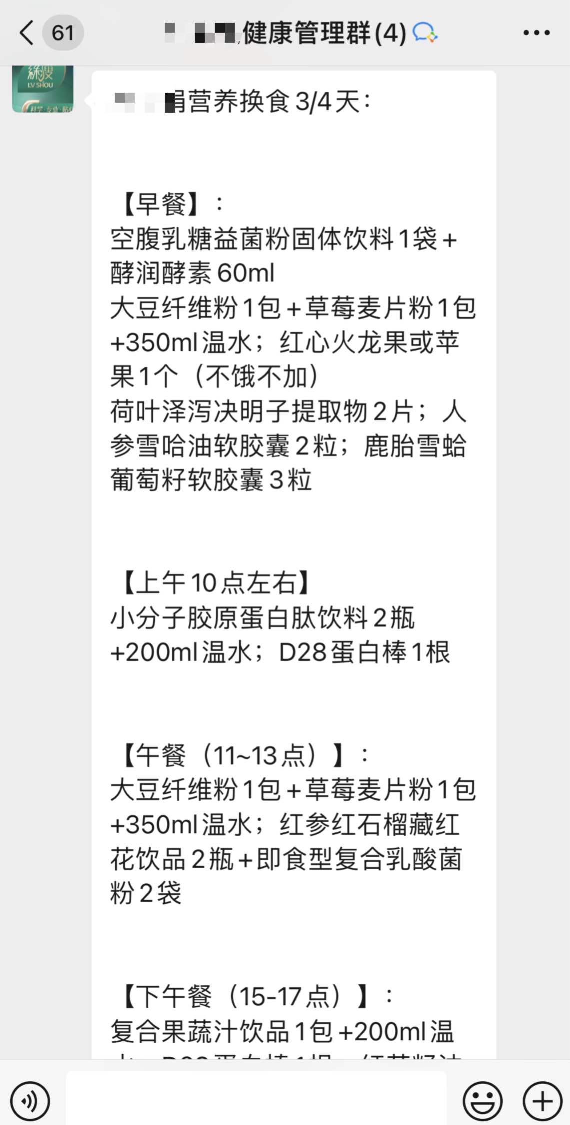 在顾问的劝说下,施女士开始频繁购买绿瘦产品。聊天记录显示,从2024年3月起,施女士一日三餐均由绿瘦公司的营养顾问搭配并监督,每日要吃8种-9种绿瘦公司的产品,4月底营养顾问开出的一日三餐建议中绿瘦公司产品多达15种。
