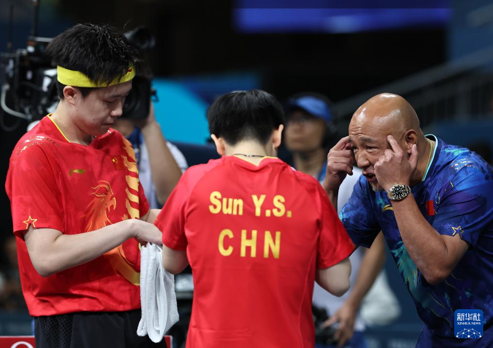 7月29日,王楚钦/孙颖莎(中)在比赛间隙接受教练肖战(右)指导。