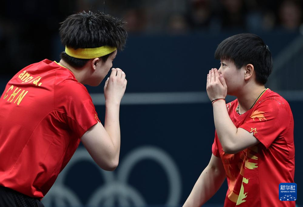 7月29日,王楚钦/孙颖莎(右)在比赛中交流。