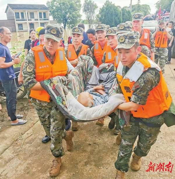 武警湘潭支队紧急出动,分别前往湘潭县射埠镇、锦石乡、易俗河镇等地进行救援,转移被困群众,转运物资,协助医务人员开展医疗巡诊。