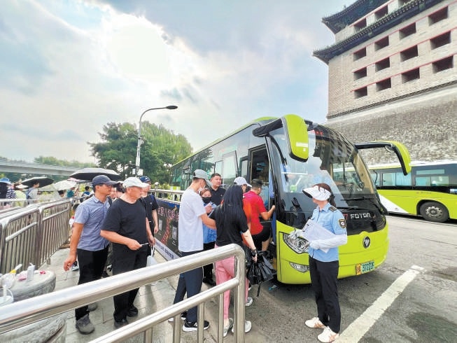 7月29日早9时,德胜门箭楼下,陆续有游客奔着877路乘车点走去。“大家别急,有序排队,先刷卡再坐车。”公交职工忙着引导游客有序上车。