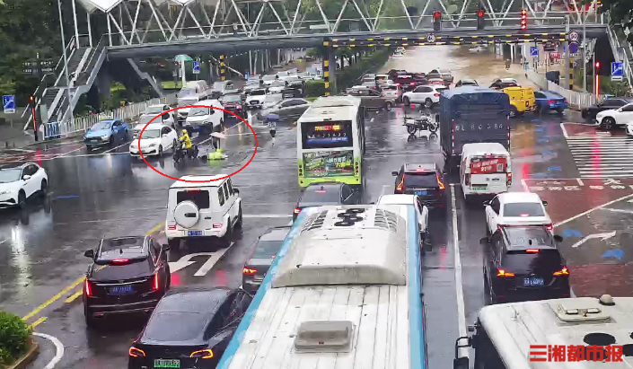 7月28日,长沙暴雨,岳麓区梅溪湖路与近湖一路交叉路口积水,交警在现场指挥交通。13时36分,穿着雨衣在路口执勤的交警突然倒在地上,此时车来车往,一旦有司机没有留意路面,后果不堪设想。