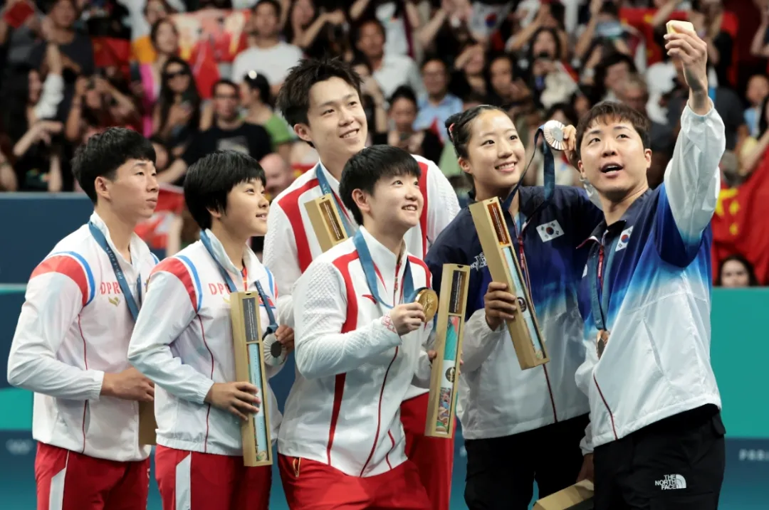 在赛后的发布会上,冠亚季军三对选手同台而坐接受了媒体采访,除了“莎头”组合外,不少记者也对亚军朝鲜组合非常感兴趣。而被誉为“神秘之师”的李正植/金琴英也在发布会上透露了一点点信息,那就是他们的确曾向中国队学习过球技。夺得金牌的中国选手和获得银牌的朝鲜选手、获得铜牌的韩国选手拍照合影(视觉中国)打入决赛的李正植/金琴英和最后的冠军得主“莎头”组合不同,两人在今年四月前几乎从没参加过任何国际大赛,直到今年四月才在巴黎奥运会混双资格赛里首次亮相,随后便取得全胜,收获了巴黎奥运会入场券。这也是时隔八年再度有朝鲜乒乓球选手登陆奥运会舞台。这对赛前不为人知的组合来到巴黎也是一路过关斩将,首轮就4比1淘汰了日本劲旅张本智和/早田希娜,从而也受到许多关注。特别是进入决赛后,他们也一度把中国的王牌搭档逼入绝境,连孙颖莎都表示对手还是相当强劲的。“今天能赢我感到很开心,因为比赛对手是之前没怎么交手过的,彼此都属于遭遇战。”孙颖莎赛后说,“他们具备一定实力,给我们带来了挑战,有很大冲击力,打法风格也有自己的特点。我觉得我们两边都发挥很精彩,每一局球都很重要,开始阶段我和王楚钦还不错,后面也一度被逼入绝境,所以很开心最后还是赢下来了。”那么朝鲜组合到底是如何取得这么快进步的呢?他们日常训练的情况如何?这也激起了现场不少外媒的好奇,发布会上更多问题都被提给了这对“神秘组合”。在记者们的追问下,两位朝鲜队员也透露了有关自己训练的一点点信息。“我们是在本国训练的,日常就是在朝鲜训练。”男选手李正植说。而被问到有传闻他们曾在中国接受过训练,女选手金琴英没有否认这个说法,而是说:“是的,我们从中国队身上学到了很多,他们一直是全球最优秀的乒乓球队伍,有很多值得我们学习的地方,我们跟这支世界排名第一的队伍有过联系。今天这场比赛我们也从中学习到很多,略感遗憾的是最后没有赢球,但我想我们表现得还不错,希望以后能更加努力,下次面对对手时争取胜利。”责编:沙兆华