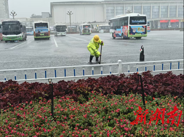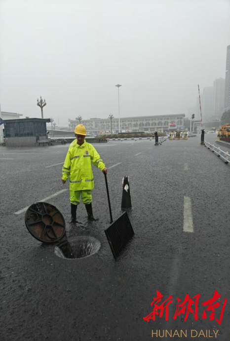 雨情就是命令,在长沙火车站广场、在人民路东岸建材、在五一路朝阳路口、在曙光北路,凡是有积水的地方,就能看到芙蓉市政人躬身助排引流的身影。他们不畏艰险,冒雨冲锋在前,淌着没膝的湍流,在各主次干道进行全面不间断巡查,发现排水堵塞,毫不犹豫徒手打开市政井,清理井内的垃圾和淤泥,确保井盖打开处都有专人值守;配合交警对积水严重路段实施交通管制,同时协调移动泵站紧急抽水,消除安全隐患,保障道路通畅。