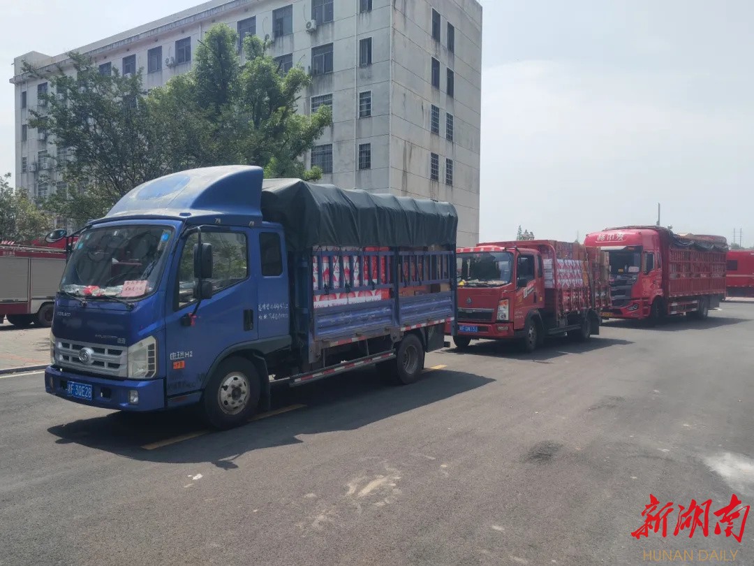 (图:湖南消防后勤保障组为各增援总队运送面包、八宝粥、方便面等补给物资)