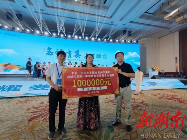 喜聚丹心结桃李,好研朱墨写春秋。在本次峰会上,新化一中更是收获了校友们的拳拳爱心。新化一中原158班校友罗鹏志、吴美华夫妇初心如磐,满腔赤诚,一次性向新化县第一中学教育发展基金会捐赠100万元作为启动资金,支持母校教学与发展。罗鹏志校友表示,感谢母校一直以来给予的特别的关爱,他们希望通过此次捐赠,为新化一中的学弟学妹们创造更好的学习环境与条件,充分发挥资助育人的重要作用,激励青年学子树立远大理想、刻苦勤奋学习。同时,这也是他们对母校培育的感恩之举,希望用自己的实际行动来为母校的发展贡献自己的一份力量。作为校友,将继续在校友工作中展现新作为、作出新贡献。