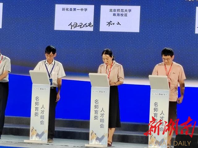 本次人才峰会的一大成果是一系列重点合作项目的达成。在首批“名师育娄”合作项目签约环节,新化县第一中学伍玉伟书记代表新化一中与北京师范大学珠海校区进行教师培训项目的签约,意味着作为百年学府、三湘名校的新化县第一中学将牵手师范类顶尖院校,一起向更高的教育教学水准迈进。