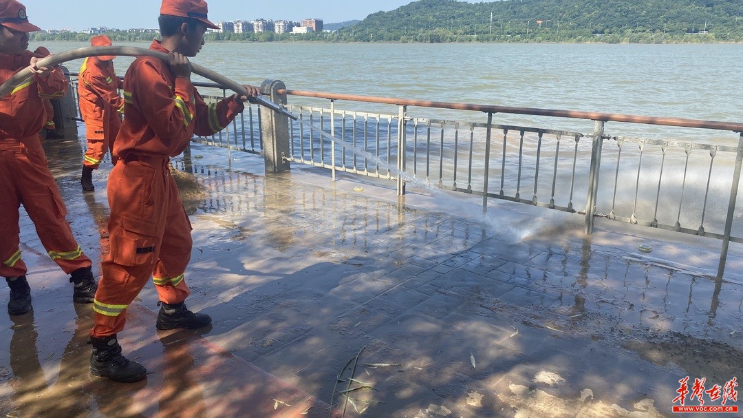 “我们出动了100名人员前来清淤。”国家消防局湖南机动队伍中队长黄彧说道,百名队员共分为10个小组,每组配备水泵清理、车辆作业和机动作业三种分工的队员,大家任务明确,有条不紊地完成淤泥冲刷、淤水清理、枯枝腐木和有害垃圾拾取等工作,在4小时内完成了对橘子洲北侧邮轮码头向南3公里范围内亲水步道的清淤工作。