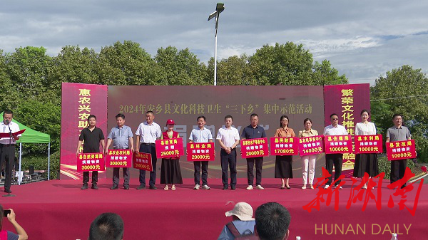 新湖南客户端7月5日讯(通讯员 陈树林)7月4日上午,安乡县2024年文化科技卫生“三下乡”集中示范活动暨“扫黄打非”进基层宣传活动在安丰乡珊珀湖社区举行。县委副书记、统战部部长李进,县委常委、宣传部部长、安丰乡党委书记刘飞,副县长蒋斌参加。