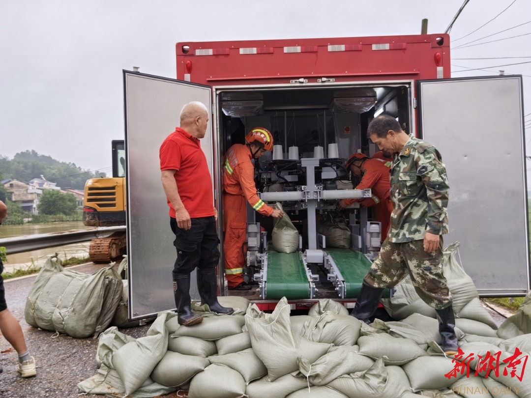 作业期间,消防员与砂石装袋模块密切配合,在雨中铲装绑扎、接力传递,俨然一条强有力的“输送带”。