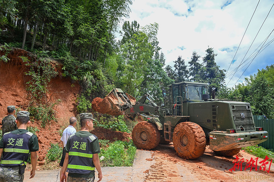 7月30日,S344线资兴市何家山至八面山段,救援人员在抢通受阻道路。