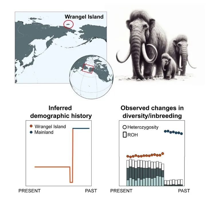 研究团队通过基因组特征分析和模拟表明,在进入弗兰格尔岛并“孤立”之后,长毛猛犸象种群经历了一次严重的“瓶颈”事件。在最严峻的时候,弗兰格尔岛猛犸象的总种群数量少于 10 只。