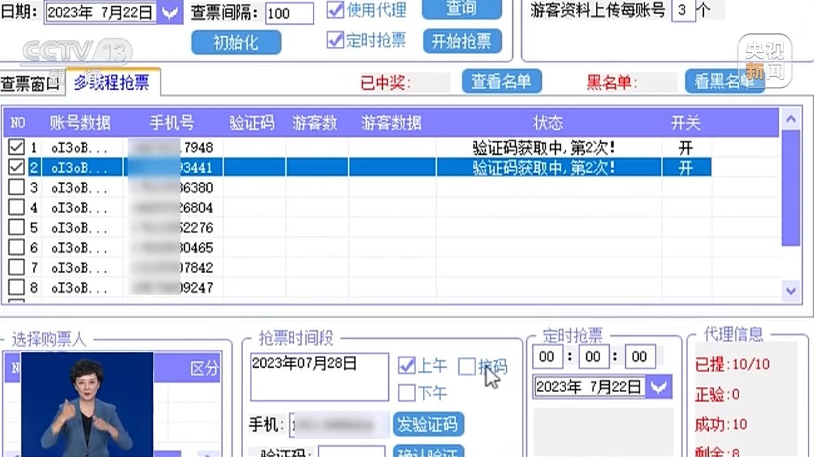 北京市海淀区人民检察院科技犯罪检察团队检察官 白磊:为了让“抢票手”“键盘手”更好抢号,把“抢票软件”做得看来很傻瓜化的,包括游客资料,抢号时间分上午还是下午,总票源以及抢号用的手机号。暴力下单模式,抢号的频率可能会很快。