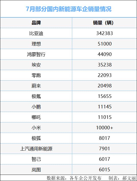 8月1日,多家新能源车企先后交出7月销售成绩单。其中,比亚迪稳居榜首;理想汽车时隔6个月单月交付量再破5万辆;蔚来汽车连续三个月销量稳定在2万辆以上;小鹏汽车和哪吒汽车落后一个“身位”,交付量徘徊在万辆左右;小米SU7交付量突破1万辆,有望提前完成“全年10万辆”的交付目标。