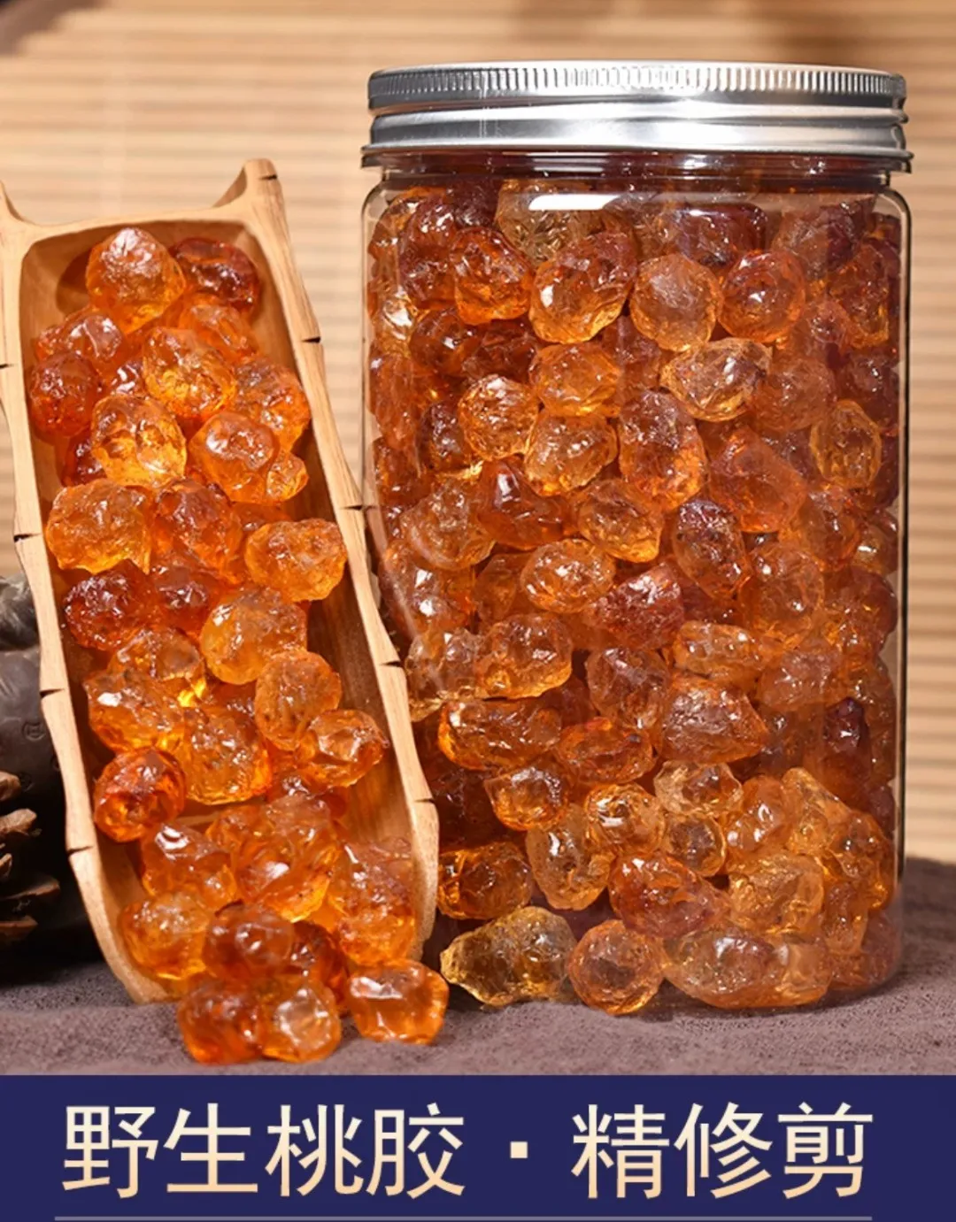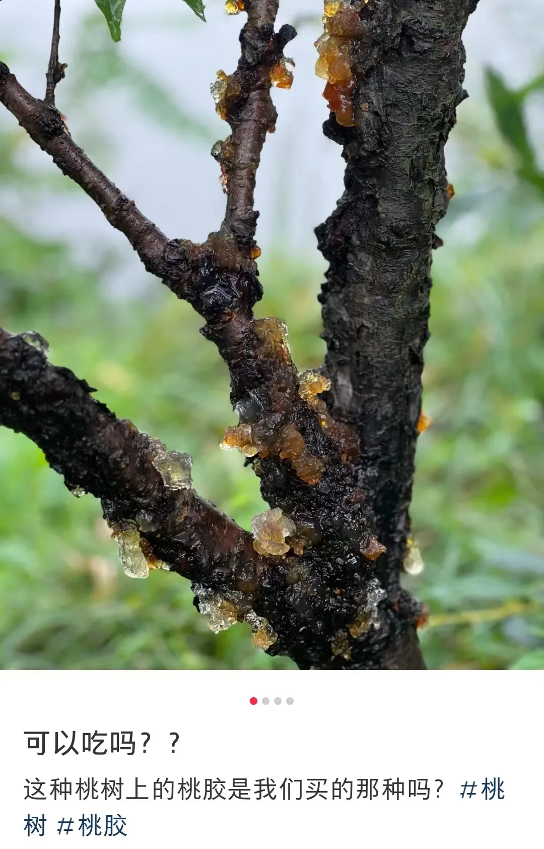 桃树上的胶,其实是一种病理现象,叫做“流胶病”。桃胶是桃树自然分泌的树脂,又名桃油、桃脂、桃花泪。