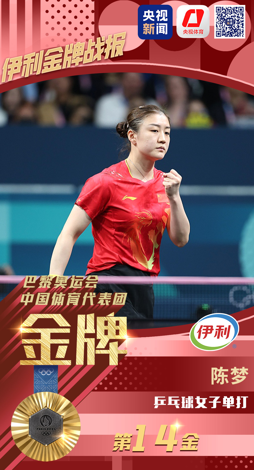 北京时间8月3日,在巴黎奥运会乒乓球女子单打决赛中,中国选手陈梦4:2战胜队友孙颖莎,成功卫冕,夺得金牌。这也是中国代表团在本届奥运会上获得的第14枚金牌。