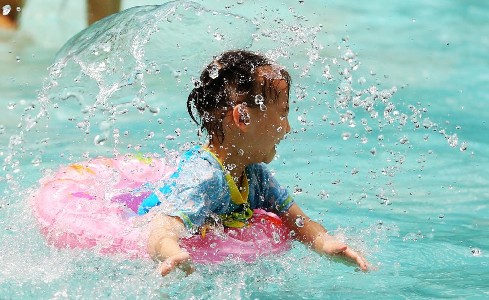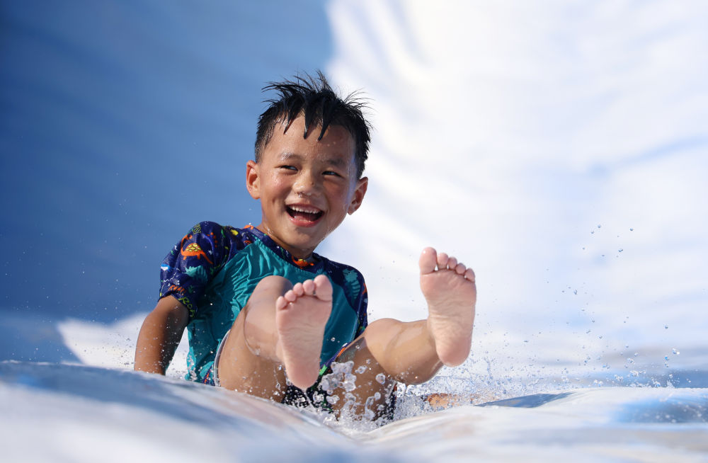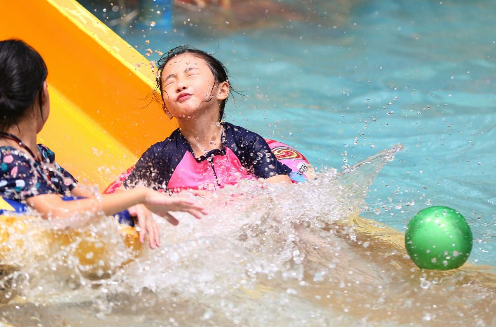 8月4日,小朋友在山东省滕州市新盈泰温泉度假村水上乐园戏水。新华社发(李志军摄)
