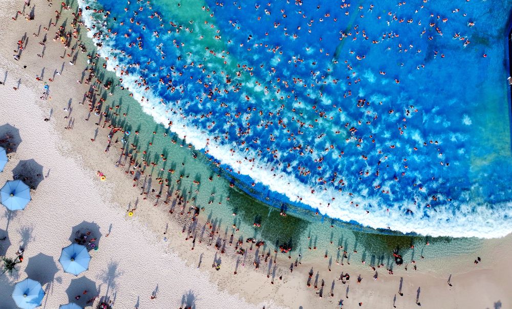 8月3日,游客在四川省泸州市纳溪区欢乐派海滩公园戏水游玩(无人机照片)。新华社发(廖胜春摄)