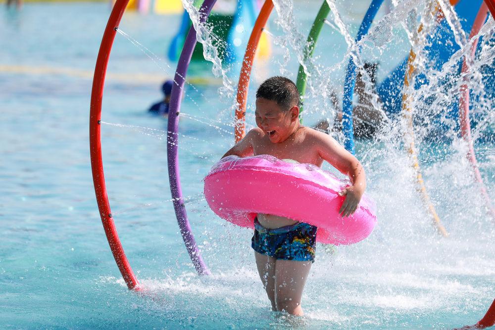 8月4日,一名小男孩在山东省临沂市郯城县郯城街道一处儿童乐园戏水。新华社发(张春雷摄)