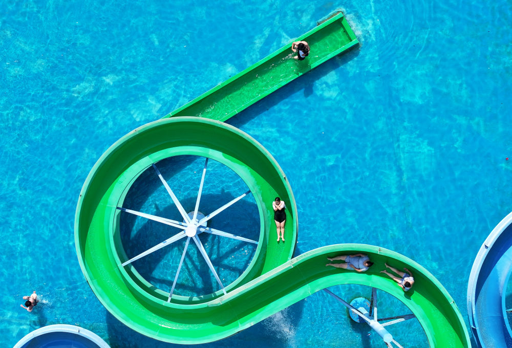 8月3日,游客在江苏扬州水上乐园戏水游玩(无人机照片)。新华社发(孟德龙摄)
