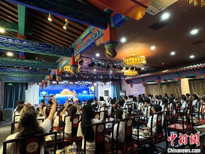 图为全体营员在老舍茶馆品茶看戏。陈美羽摄