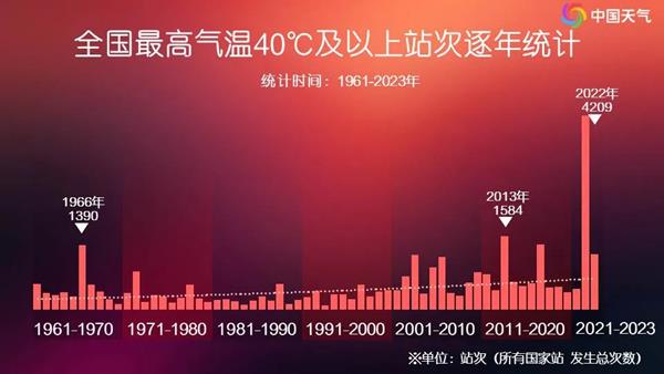 40℃以上的高温酷热天气真的越来越多了吗?从数据来看,是的。中国天气网通过盘点1961年至2023年气象大数据发现,这63年中,全国国家级气象观测站出现40℃及以上的高温总体确实呈现增长趋势,其中2022年最多,高达4209站次。