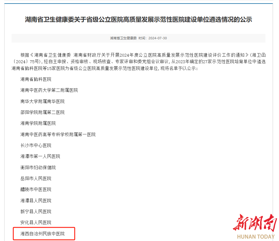 今年7月,湘西州民族中医院入选湖南省公立医院高质量发展示范性医院建设单位,是湘西土家族苗族自治州唯一入选机构,也是全省唯一一个入选的地市级三甲中医院。