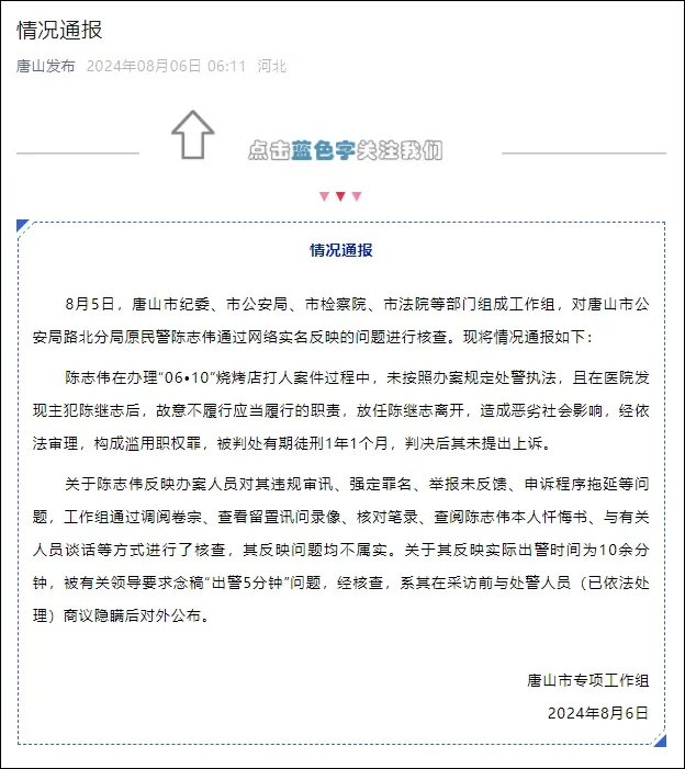 8月6日,“唐山发布”微信公众号对“唐山市公安局路北分局原民警陈志伟通过网络实名反映问题”一事,发布情况通报↓