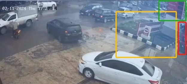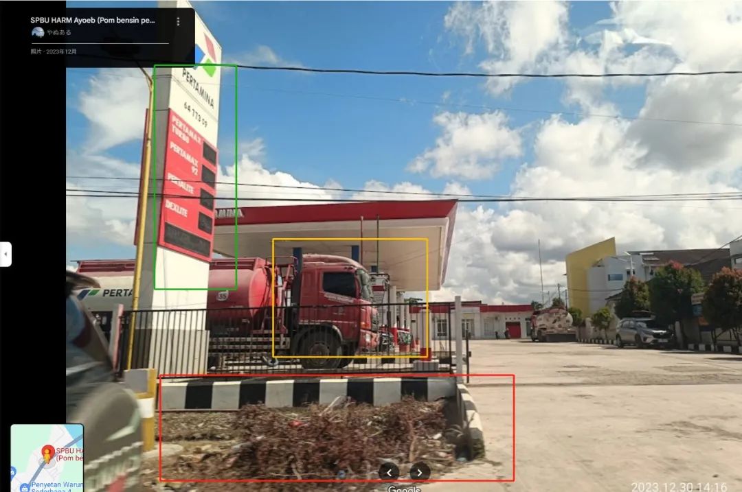在谷歌地图定位Teluk Bayur的Kilo 5地区的SPBU加油站,其2023年12月拍摄的街景图与网传画面右下角的多个标志性元素完全一致,可见网传视频并非摄于中国。