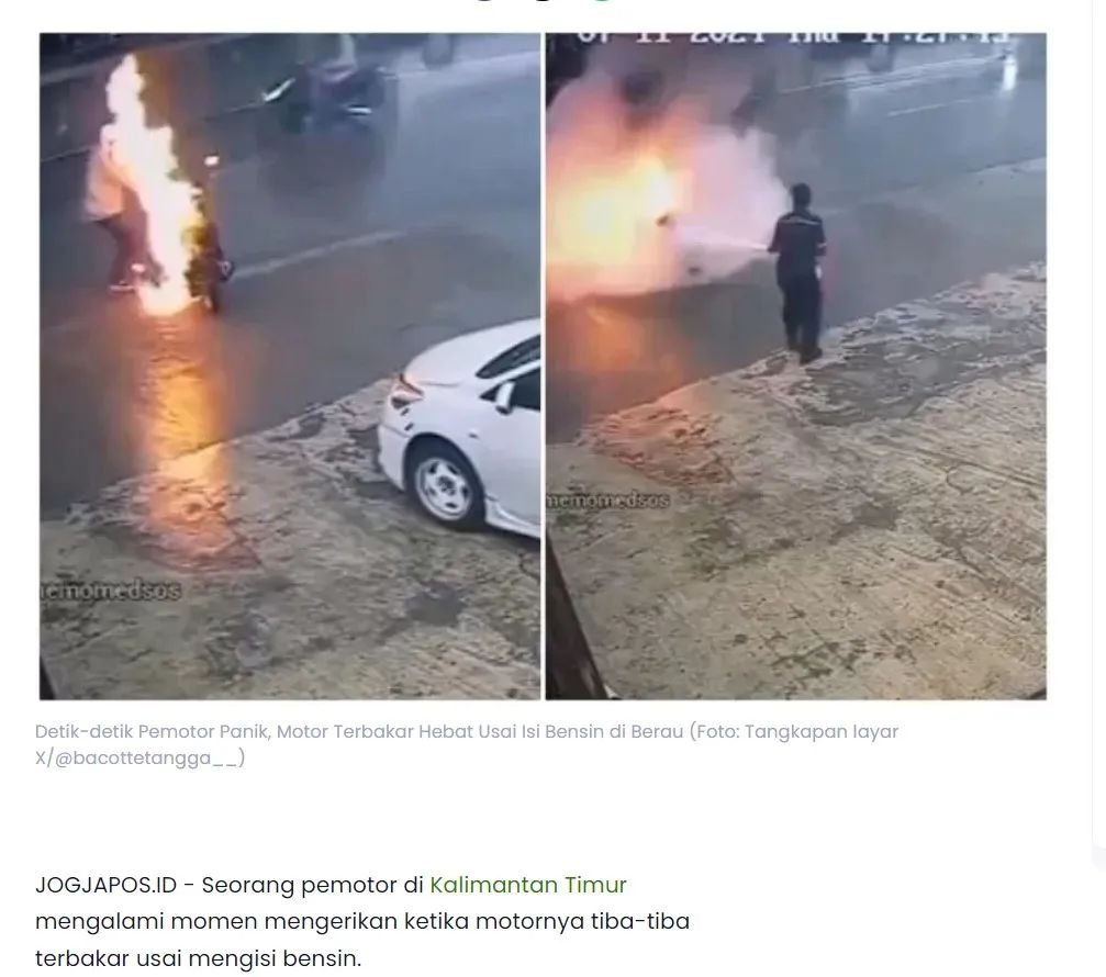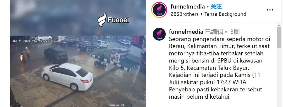 通过jogjapos.id的报道截图,可以看出网传视频似乎对原视频进行了镜面翻转,根据翻转后的图片反搜,结果显示,Instagram用户早些时候曾发布完整视频和画面,并称,“东加里曼丹省柏劳一名摩托车手在Teluk Bayur的Kilo 5地区的一个加油站(SPBU)加油后,摩托车突然失火。”