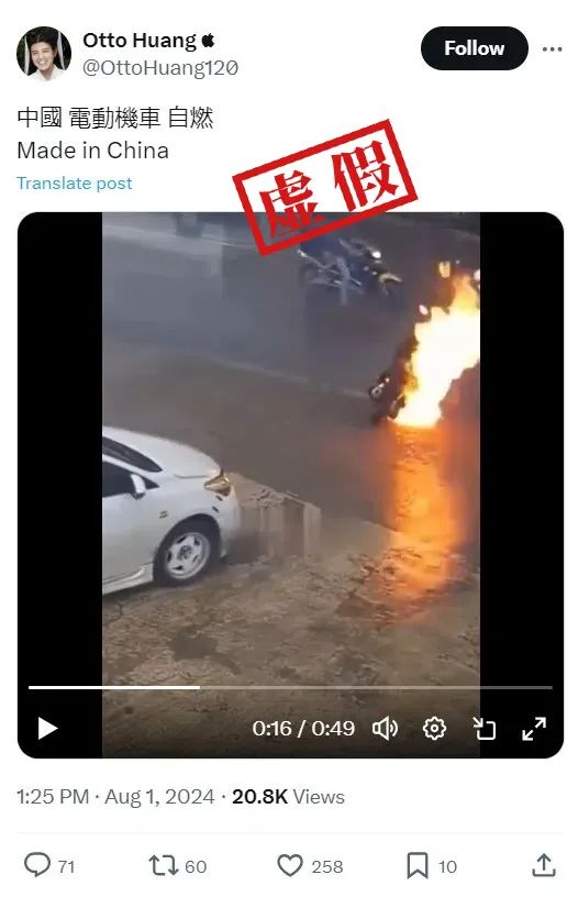 近日,海外社交平台有用户发布视频并配文称是“中国电动机车自燃”,然而该视频存在诸多可疑之处。