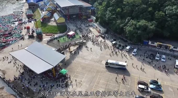 8月3日,游客在尾点正常排队等大巴。在发送16车以后,游客在尾点闸机前发生争执,景区安保调节、劝阻游客不予理会,人越聚越多,导致4.8公里路段开始堵车,倒船车无法运输。