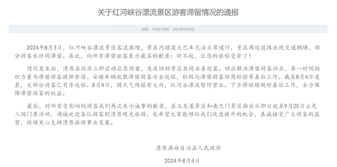 8月4日,清原满族自治县人民政府发布《关于红河峡谷漂流景区游客滞留情况的通报》。其中提到,2024年8月3日,红河峡谷漂流景区客流激增,景区内摆渡大巴车无法正常通行,景区周边道路出现交通拥堵,部分游客长时间滞留。截至8月4日凌晨,大部分游客已有序返程。8月4日,因天气预报有大雨,红河谷漂流暂停营业。全文如下——