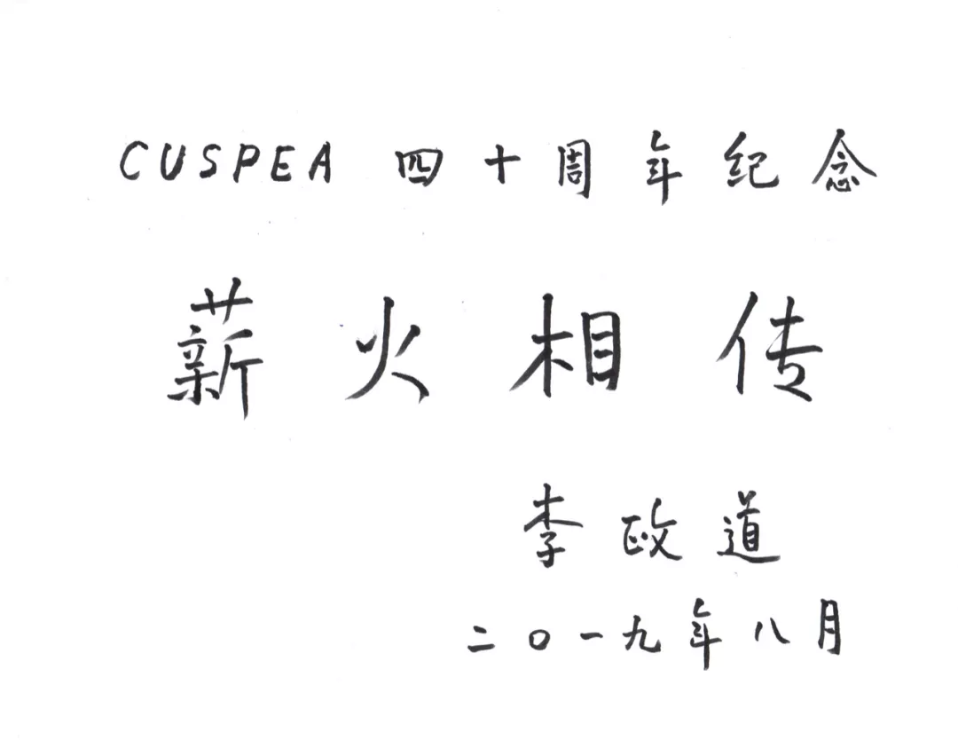2019年,李政道为CUSPEA(中美联合培养物理类研究生计划)四十周年庆活动题词:薪火相传。