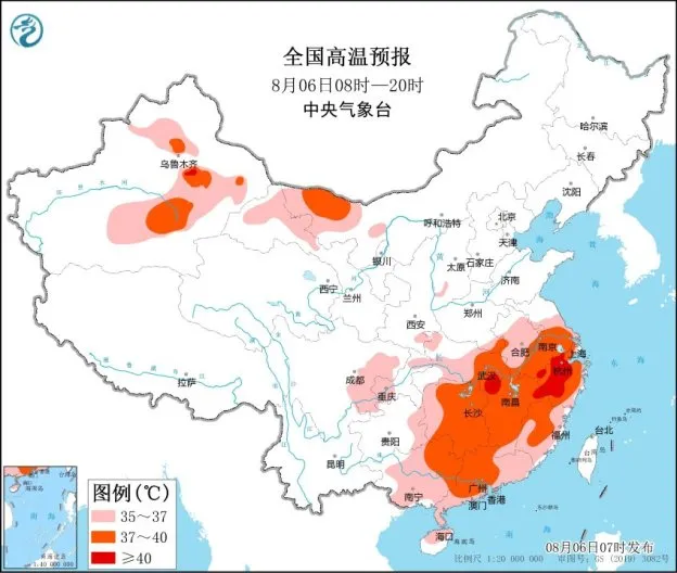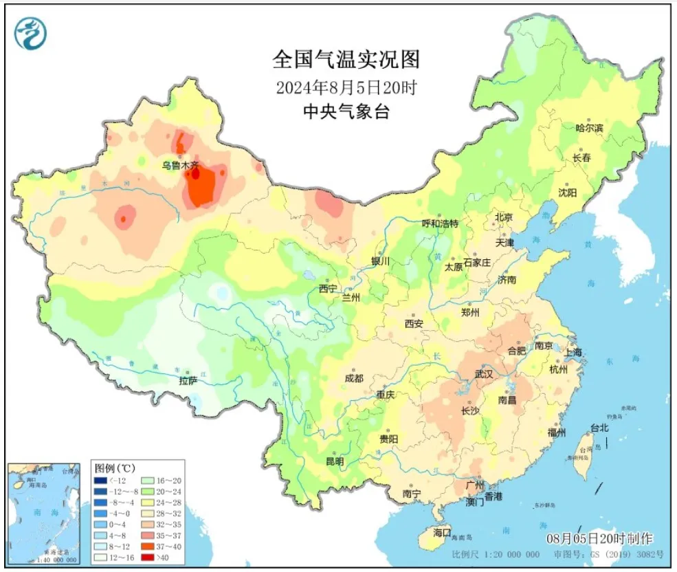 8月5日晚20时,多地气温仍在32℃以上。图片来源:中央气象台