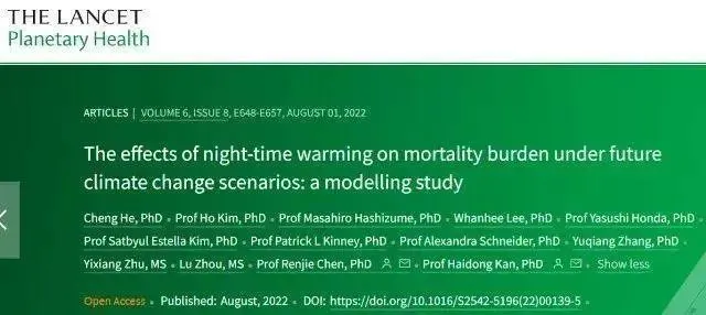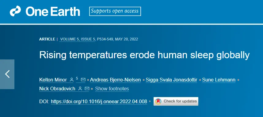 2022年8月发表于《柳叶刀—星球健康》的国际合作研究指出,预计到本世纪末,气候变化引发的夜间高温,将使全球死亡率增加60%。这支由中、韩、日、德、美科学家组成的研究团队称,到2090年,在东亚的28个城市,“热夜”事件的平均强度将翻一番,温度将从20.4℃增加至39.7℃。过高的温度破坏了正常睡眠模式,从而增加疾病负担。
