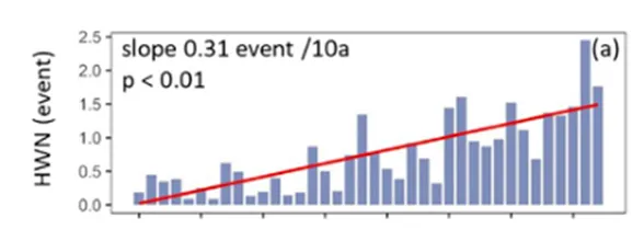 1980-2017年中国夜间热浪事件次数的时间序列及趋势。图片来源:Shi, Z. et al., 2021