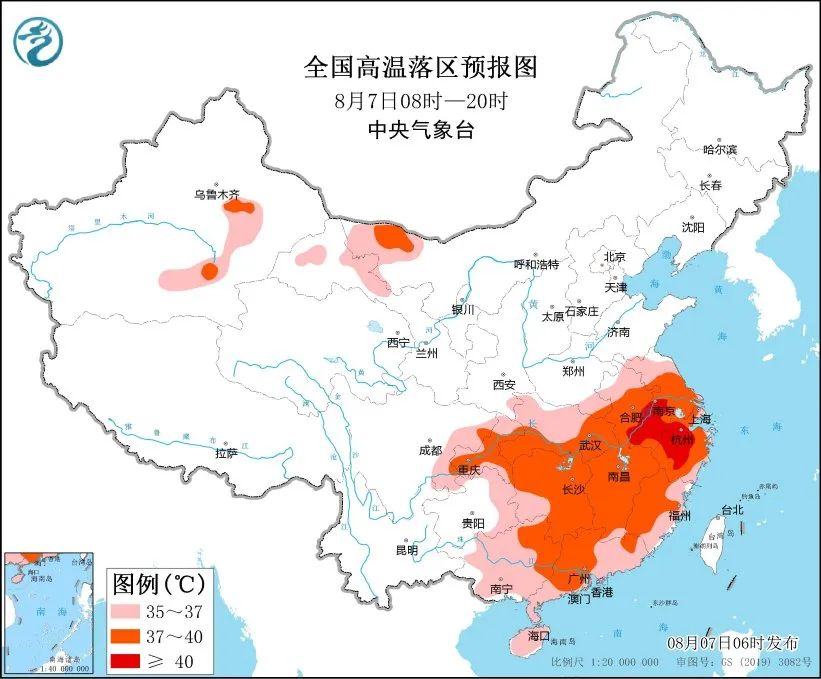 预计8月7日白天,内蒙古西北部、新疆南疆盆地、甘肃河西、河南南部、安徽、江苏、上海、湖北、湖南、江西、浙江、福建、四川盆地中东部、重庆、贵州东部、广西大部、广东、海南岛大部等地有35℃以上高温天气,其中,内蒙古西北部、新疆南疆盆地、安徽中南部、江苏中南部、上海、湖北东部和南部、湖南大部、江西、浙江、福建大部、重庆大部、广西东部、广东中西部和东北部等地部分地区最高气温37℃以上,安徽南部、江苏西南部、浙江中西部局地可达40℃以上。