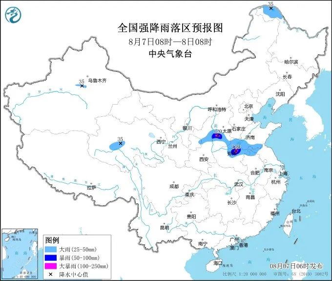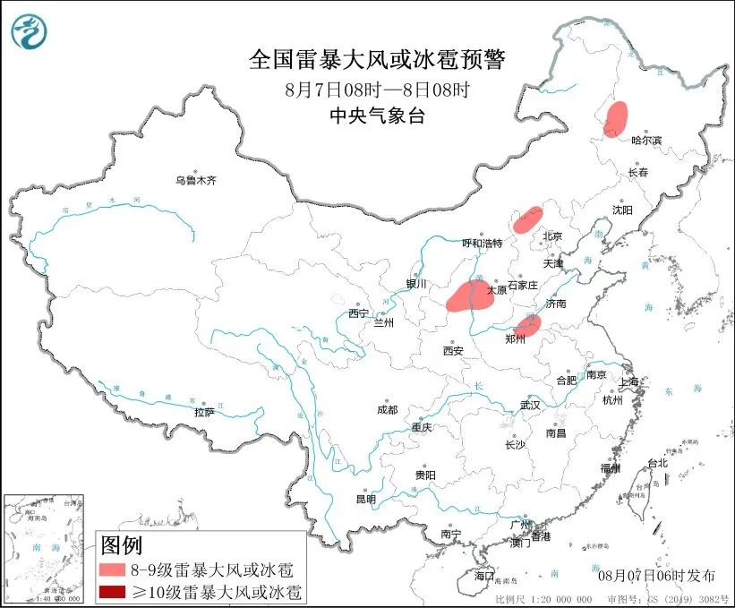 中央气象台8月7日6时继续发布强对流天气蓝色预警:
