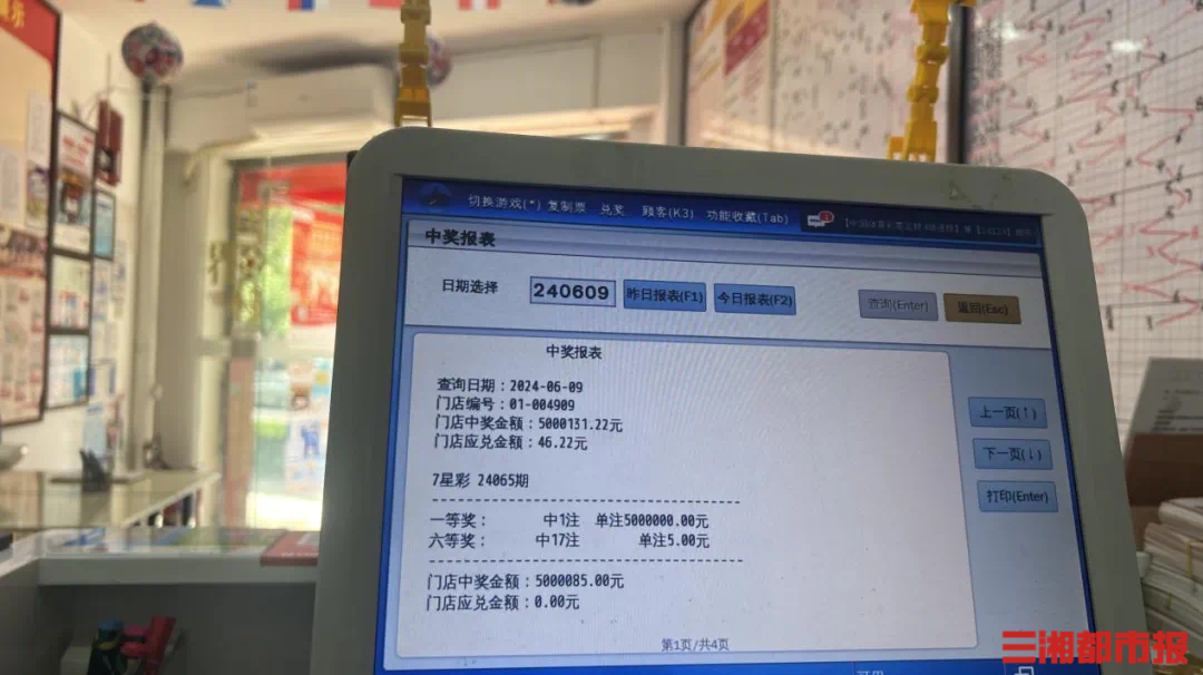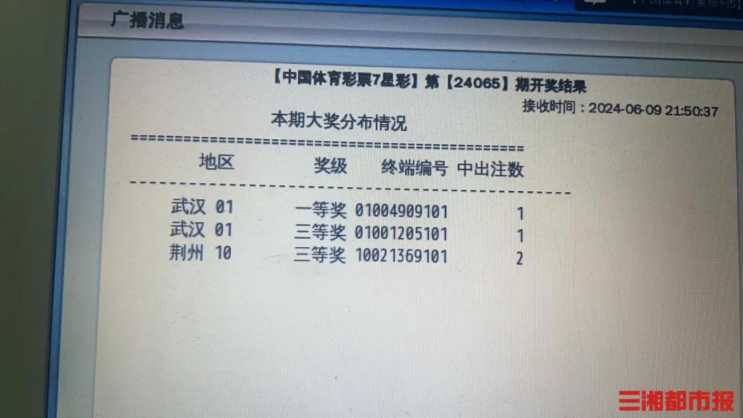 2024年6月9日,7星彩第24065期开奖,中奖号码为“9 5 5 1 4 4 + 6”。当期全国共开出2注一等奖,其中1注花落湖北武汉04909体彩代销点,奖金500万元。