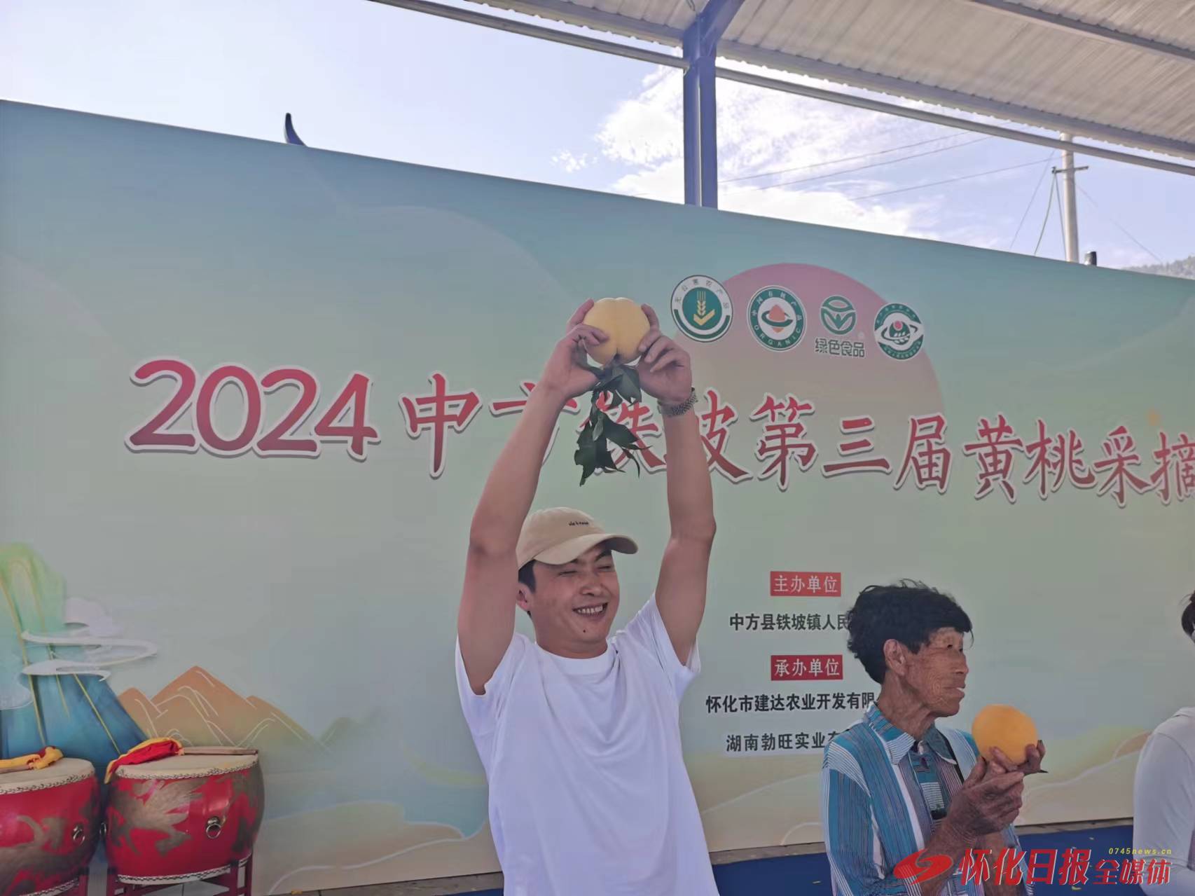“来尝一尝,今天早上刚摘的黄桃,又脆又甜!”8月6日,在2024中方铁坡第三届黄桃采摘节活动现场,记者看到村民们正在向前来参加活动的嘉宾朋友推销“铁坡黄桃”。对村民们来说,黄桃不仅是增加收入的“黄金果”,也是带动他们致富的“扶贫果”。