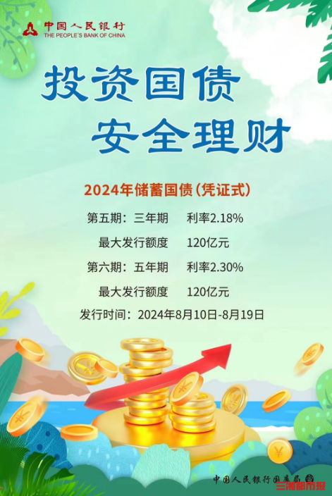 三湘都市报·新湖南客户端8月9日讯(全媒体记者 潘显璇 通讯员 张紫毅)想要购买储蓄国债的市民注意了,新一轮储蓄国债来了。2024年第五、第六期储蓄国债(凭证式),定于8月10日至19日发行。