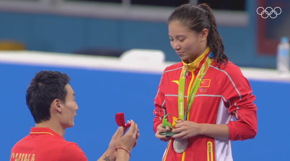 在奥运会历史上,这样浪漫的“秀恩爱”时刻并不少见,最让人印象深刻的,当属2016年里约奥运会上秦凯对何姿的“突然袭击”。何姿在跳水女子3米板项目的争夺中憾负队友施廷懋,拿到一枚银牌。颁奖仪式结束后,在知情工作人员引导下,冠军和季军分别被带到场边。秦凯走向何姿,单膝跪地,向其求婚。