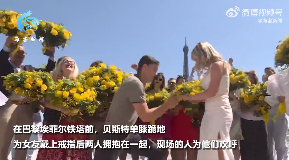 在巴黎埃菲尔铁塔前,贝斯特单膝跪地,为女友戴上戒指后两人拥抱在一起,现场的人为他们欢呼。贝斯特准备了超过2700朵黄玫瑰,他解释说,每一朵黄玫瑰都代表着和女友在一起的一天,一共2738天。↓↓↓