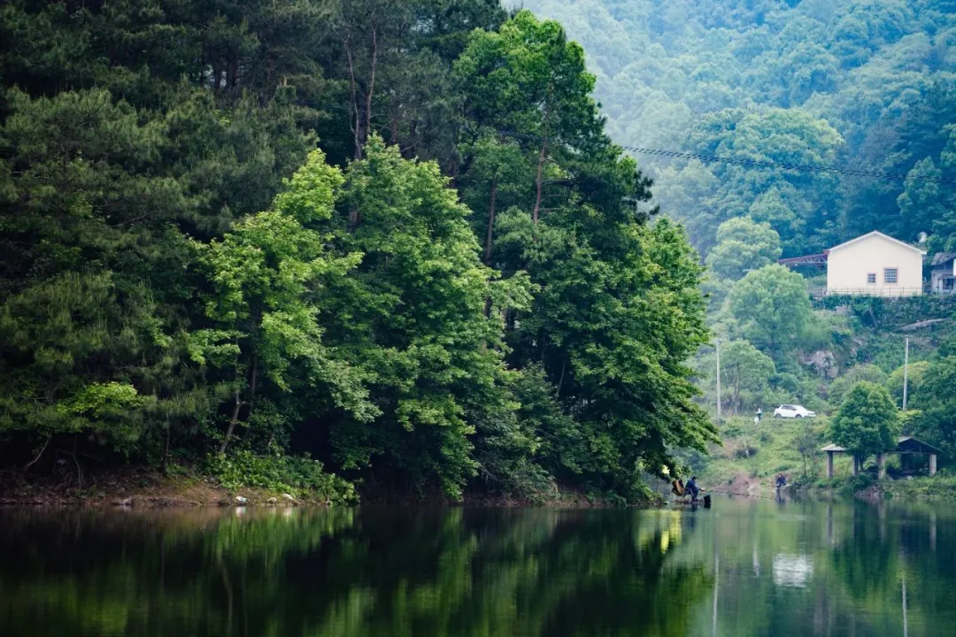 在丰梅山庄吃过飘香四溢的饭菜,踏入葱郁的森林,四周是参天的树木和清新的空气,从森林中的羊肠小道依山而入,路的左手边是水库。