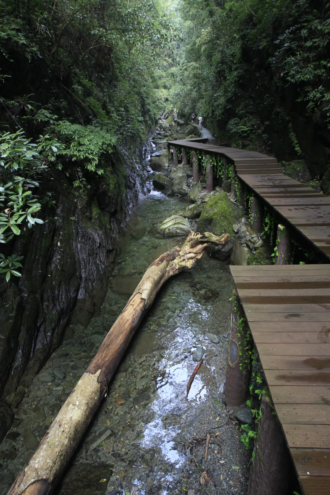 一路上都有淙淙的水声相伴,流水浸染出漫山绵延自远古的无尽绿意,草木藤蔓虽已进入初秋,却仍不失翠色。这里有大大小小的瀑布,还有许多清澈见底的小溪,你可以在其中随意嬉戏打闹,尽情玩水,享受大自然的清凉与乐趣,仿佛置身于一幅生动的山水画卷之中。